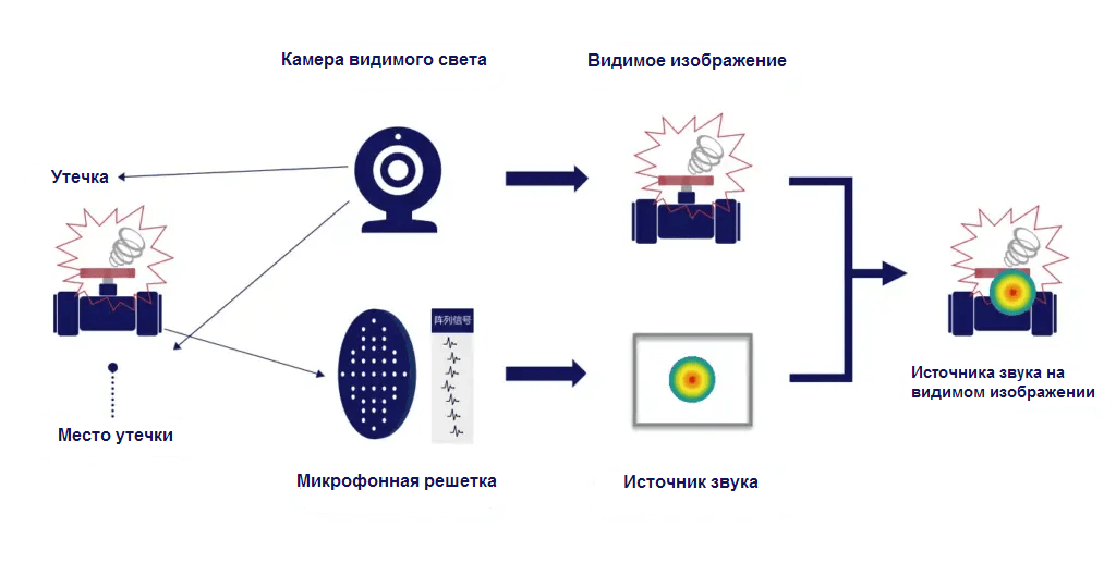 Базовый принцип работы системы: утечка газа под давлением → ультразвуковой сигнал → цветная акустическая карта, совмещенная с видеоизображением.