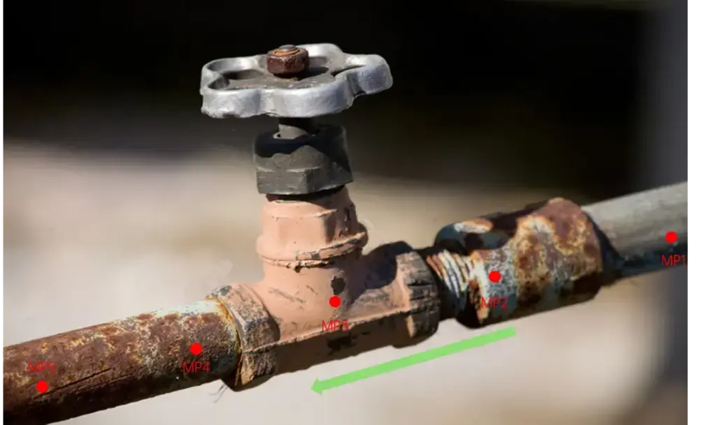 MP5: после клапана на расстоянии 1–2D от MP4 (рекомендуется выбирать точку на стенке трубы сразу за фланцем клапана). В ограниченном пространстве расстояние MP5–MP4 допускается уменьшить до 0,5D.