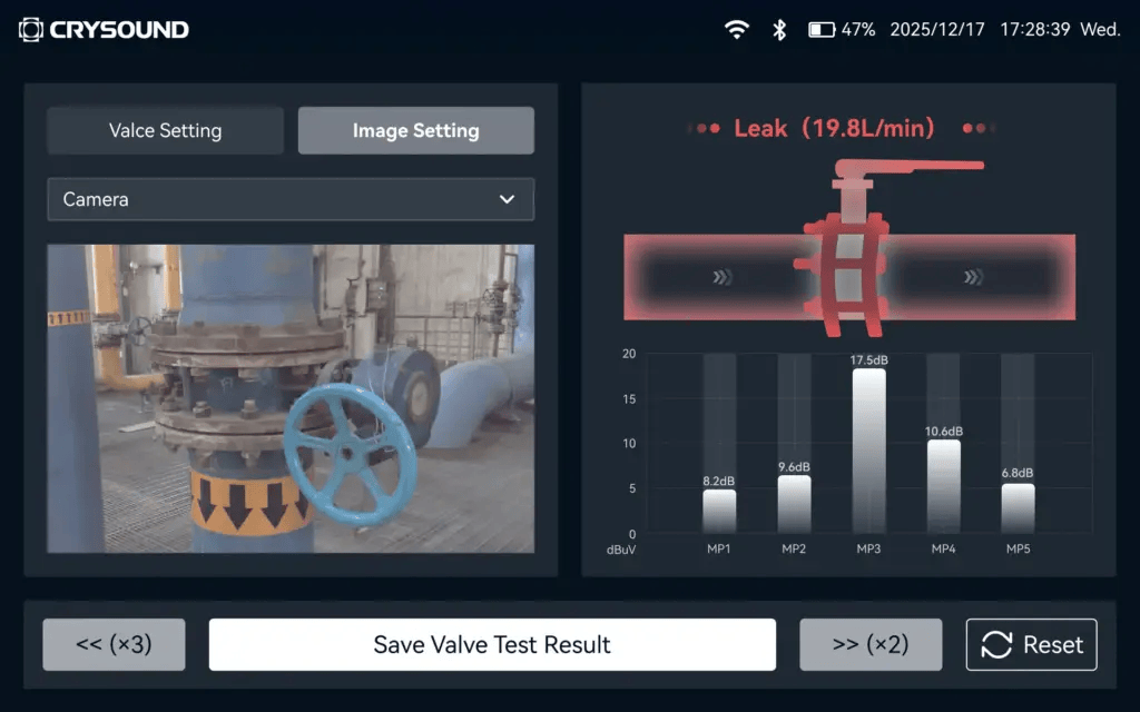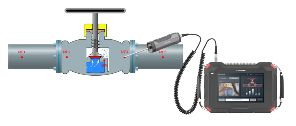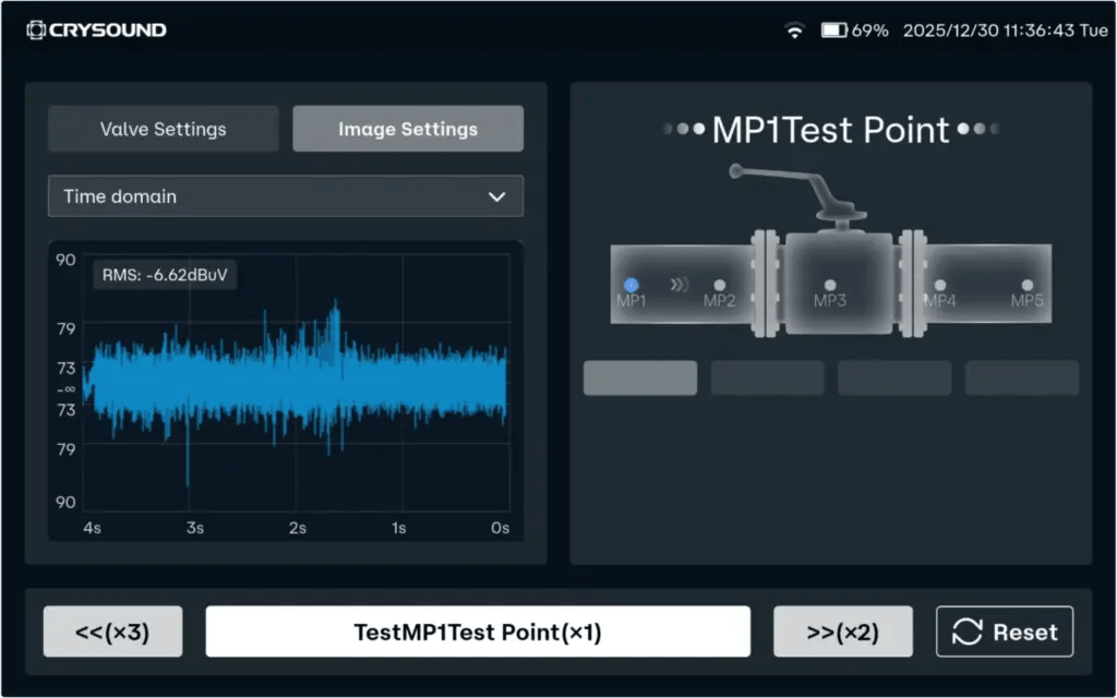 Приложение для поиска внутренних утечек Crysound предлагает стандартизированный рабочий процесс с наглядной визуализацией. Оператор следует экранным подсказкам, последовательно устанавливает контактный ультразвуковой датчик в нескольких точках измерения и нажимает «Test». Результаты отображаются на экране, а система автоматически обнаруживает внутреннюю утечку по завершении инспекции.