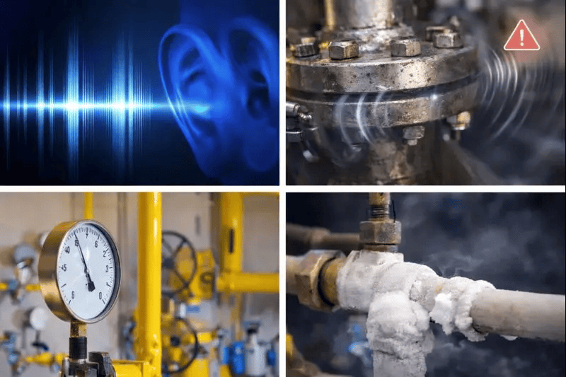 Если при закрытом клапане уплотнительные поверхности не прилегают полностью, рабочая среда проходит через мелкие зазоры под действием перепада давления в область низкого давления, образуя высокоскоростные микроструи и турбулентный поток. Утечка сопровождается характерными признаками, включая звук/ультразвук, вибрацию, аномальное поведение давления, температурные отклонения или обледенение.