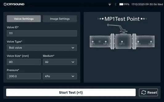 В программном обеспечении предусмотрен стандартизированный ввод параметров: идентификатора, типа и размера клапана, типа среды и перепада давления. Это облегчает сопоставление результатов инспекций на одной установке, между сменами и операторами, делая повторные проверки и отслеживание изменений более согласованными.