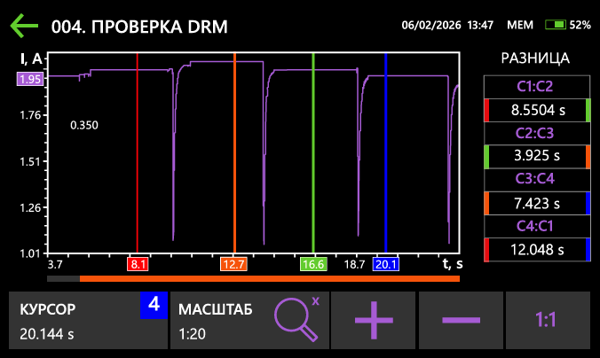 Режим безразборной проверки РПН помогает оценить состояние переключающего устройства с токоограничивающими резисторами без вскрытия бака контактора. Измеряются мгновенные значения тока при его протекании через обмотку трансформатора и контакты РПН в процессе переключения между отводами. По результатам строится график DRM, отражающий изменение тока в моменты переключения. По графику определяются время перехода между отводами и общее техническое состояние устройства. Анализ графика выявляет не только факт неисправности, но и характер дефекта.