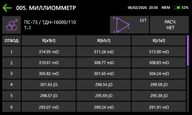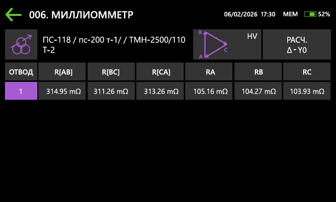 Прибор автоматически рассчитывает характеристики по нормативным требованиям: относительную разность сопротивлений обмоток, приведение значений к паспортной температуре, определение сопротивлений фазных обмоток по линейным сопротивлениям, а также выявление фаз с отклонением более 2%. Результаты сопоставляются с паспортными данными. Итоги расчётов выводятся на дисплей сразу после измерения.