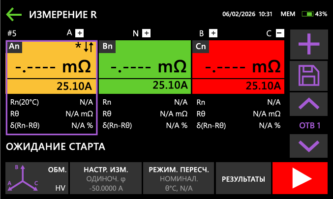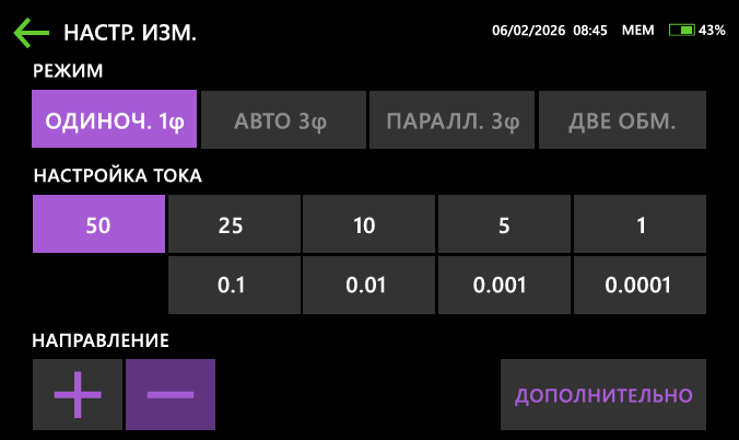 Сила тока до 50 А устанавливается вручную из ряда значений или в автоматическом режиме. В авторежиме прибор самостоятельно определяет оптимальный измерительный ток и сопротивление объекта.