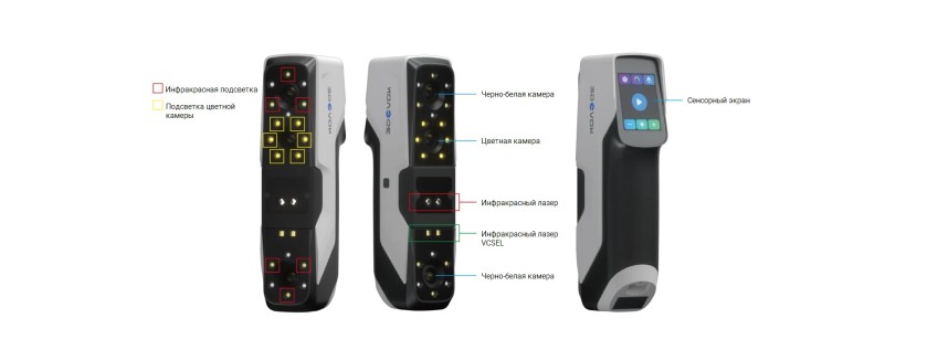 - Сканирование без маркеров благодаря инфракрасному лазеру и спеклу