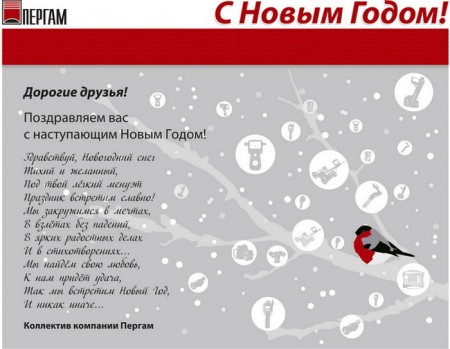 Дружный коллектив компании Пергам желает Вам в наступающем году исполнения всех заветных желаний и осуществления планов. Здоровья Вам и Вашим близким, удачи во всех делах, покорения новых вершин в бизнесе и мудрости в принятии решений.